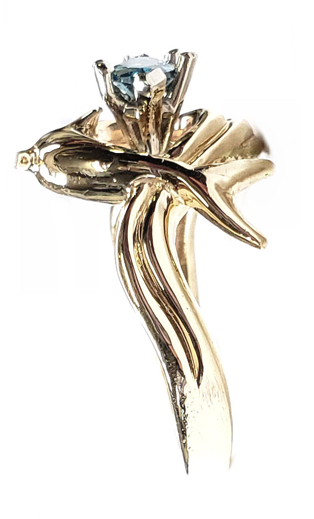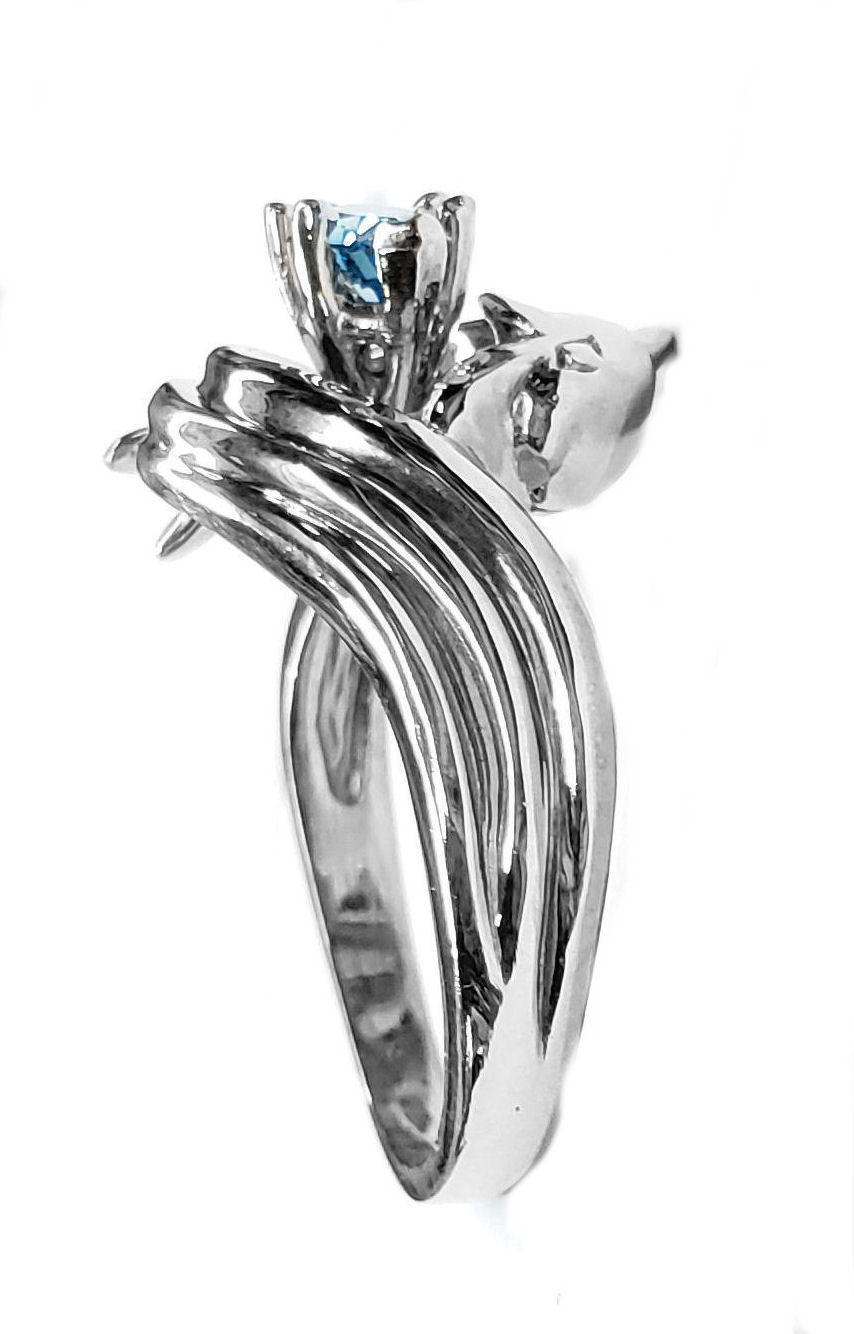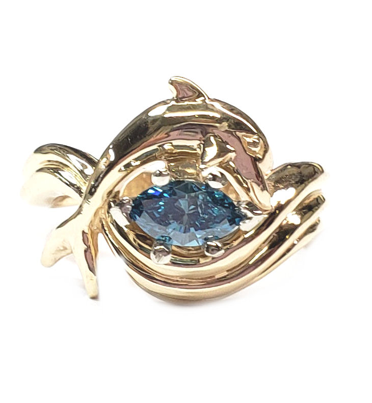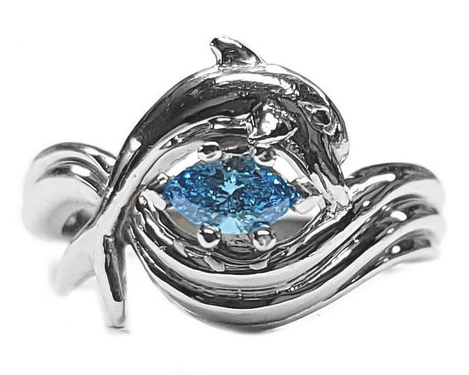 This beautiful dolphin engagement ring is the exact ring shown in the movie independence day that is loved by many. It is a very detailed dolphin going halfway around the diamond in the center and a curved grooves on the other side. The center stone is a 1/4ct. marquise shaped diamond, fancy blue color, SI1 clarity. The diamond is a natural diamond that has been irradiated blue. It is set in a 6 prong setting.