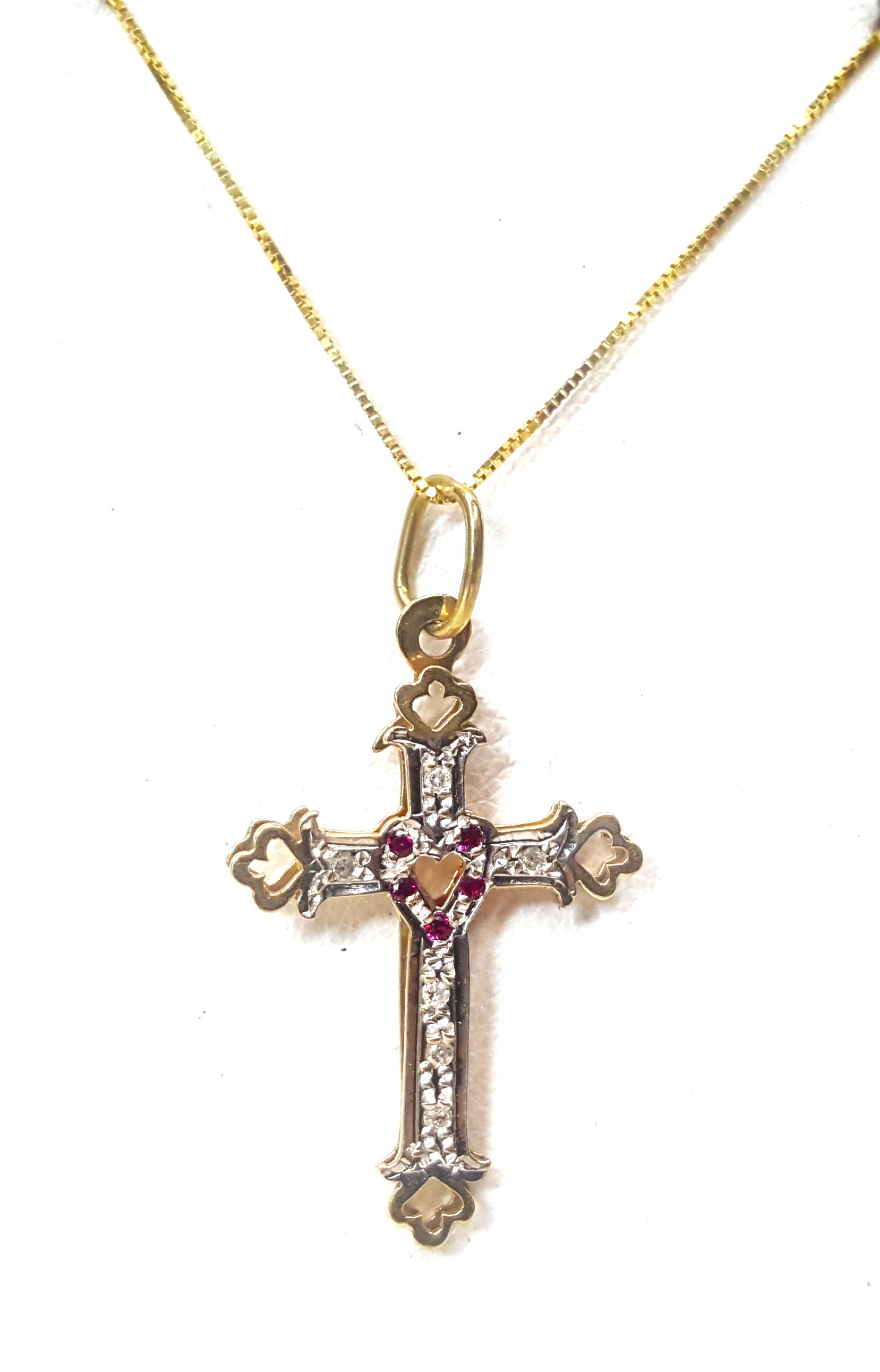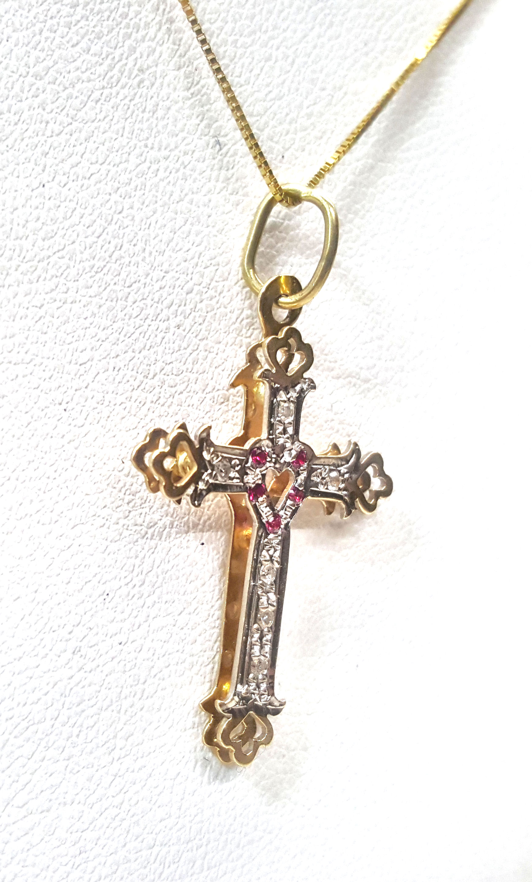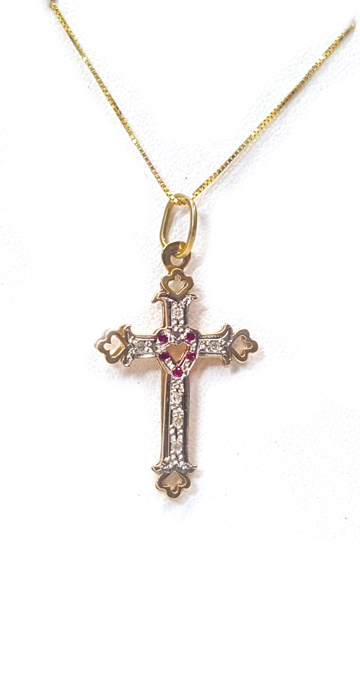 14kt yellow gold "3D" cross pendant. This cross has a heart design in the center with red stones pave set in it, and there are 6 diamonds weighing 10pts. of single cuts pave set around the heart and in it. The pendant is 1 1/4" high with the loop and weighs 1.6 grams. This cross does NOT come with a chain.