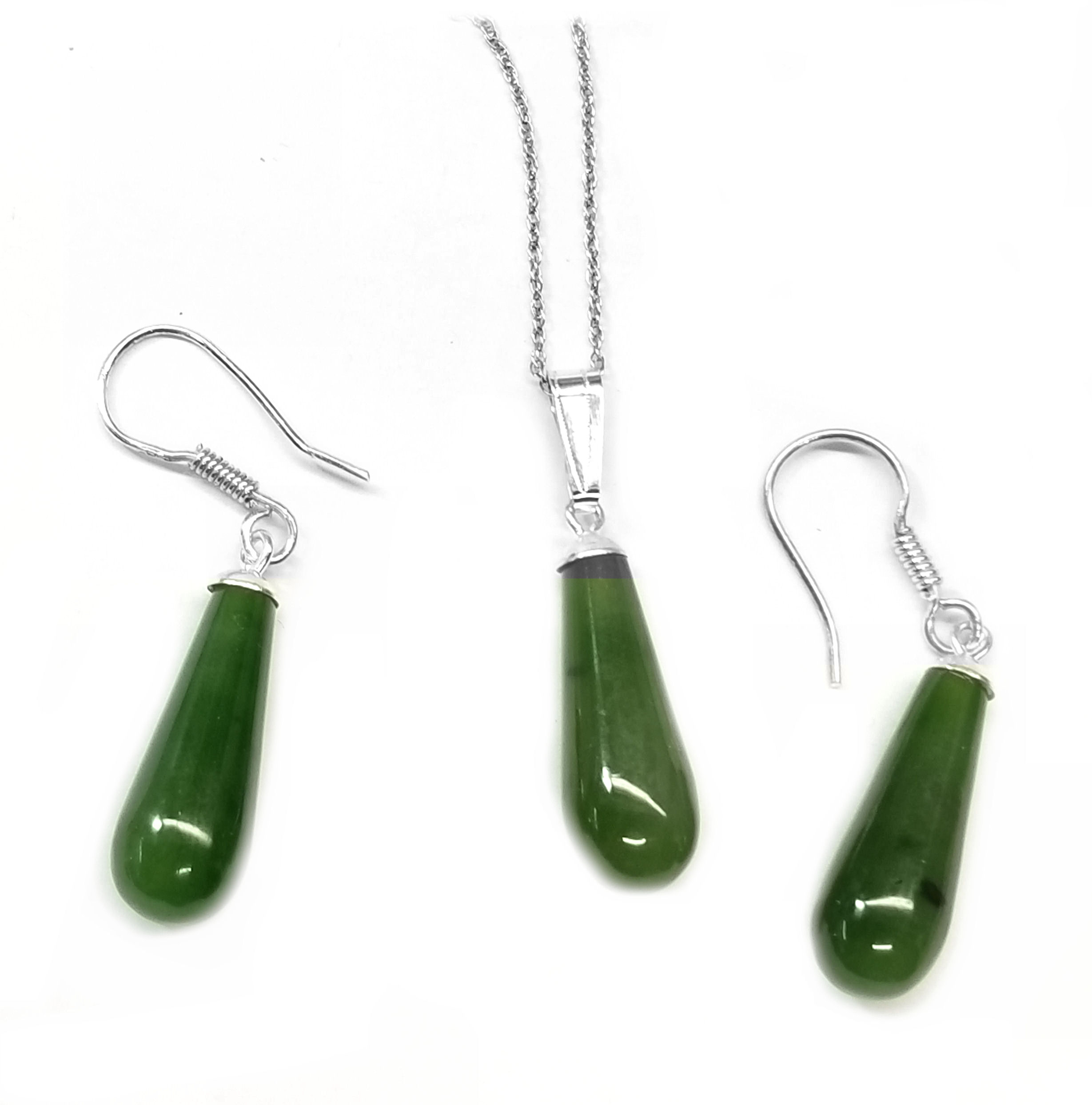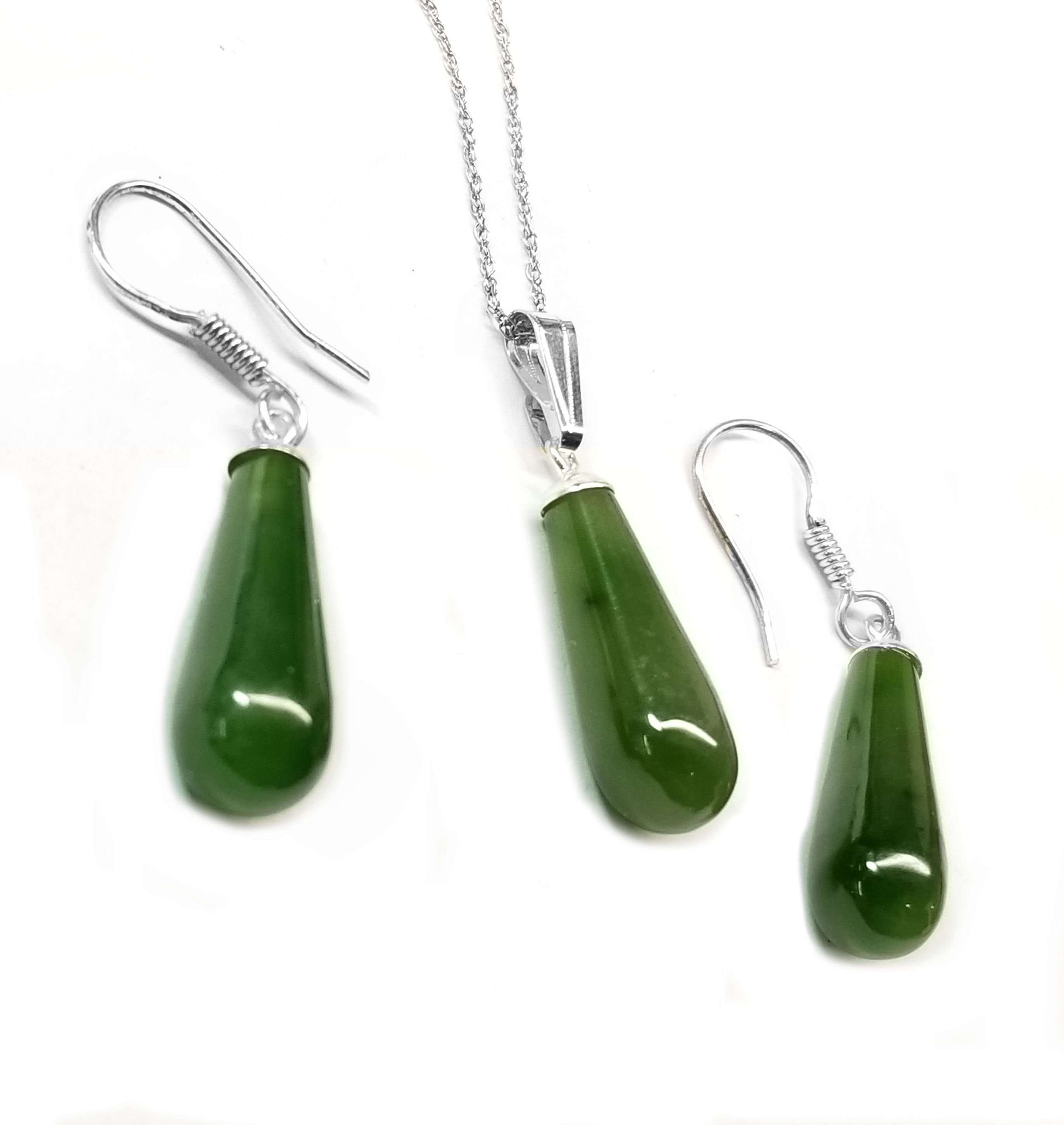 Genuine Jade natural gemstone matching jewelry set. The jade and has somoe black lines running through the main green coloring. These teardrop stones measure 23 x 9 x 6 mm. The set comes in white metal findings. The earrings are on french wires(shepards hook), the pendant has a small bail and an 18" chain. The pictures are the actual stones and are magnified to accurately show the true colors.