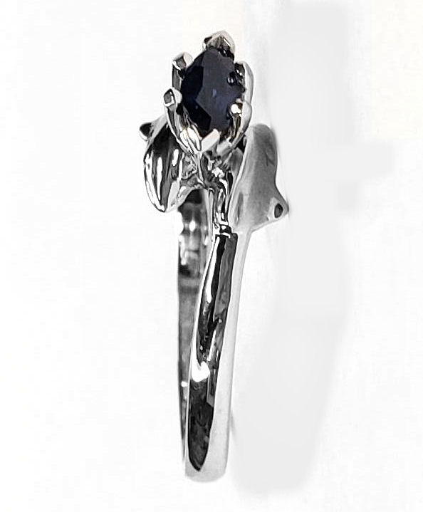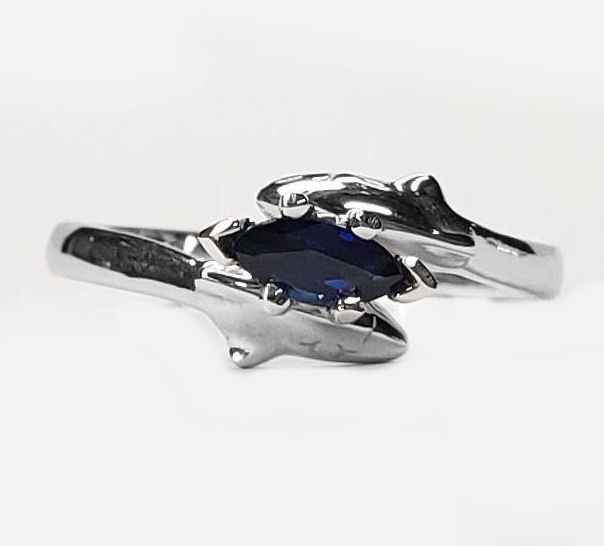 14kt. gold double dolphin engagement ring that has a dolphins head on the end of each side of the ring, and there is a 30pt. marquise cut genuine sapphire set in a 6 prong setting in between the 2 heads. This ring has a matching wedding band that fits right up next to the engagement ring if you are going to need a wedding band in the future.